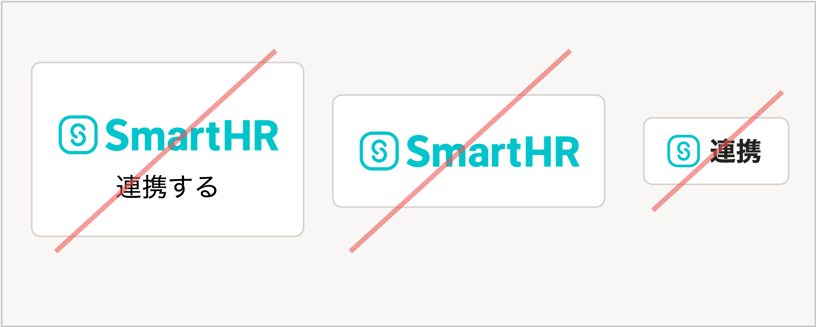 • SmartHRロゴをボタンの要素として内部に配置することは、ユーザーに誤解を与える可能性があるため避けてください。ロゴは、あくまでSmartHRというサービスを示す識別子として扱ってください。 ボタンのNG例が3つ。ボタンの要素として、ロゴや、ロゴの一部が利用されている。
