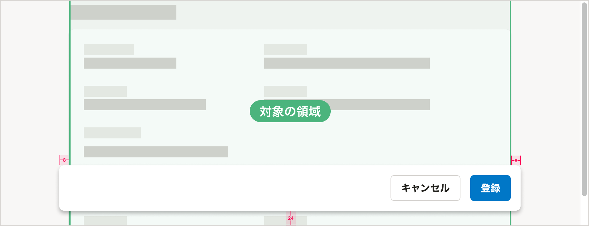 対象の領域の左右に0.5(8px)ずつはみ出し、画面の下辺から1.5(24px)の余白をとった位置に置きます。