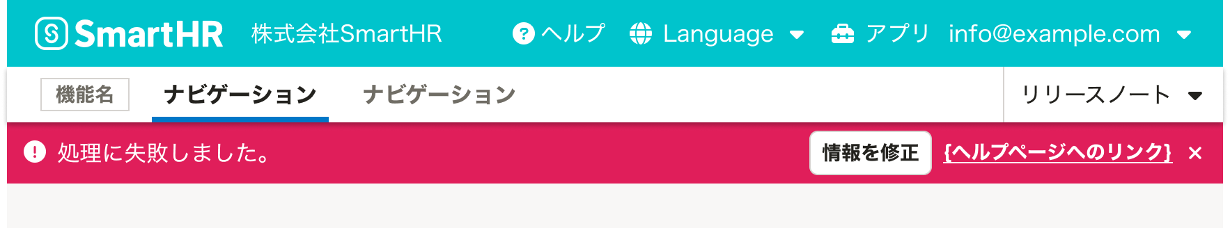 スクリーンショット: HeaderとAppNaviとNotificationBarが垂直方向に積み重なっている。NotificationBarはerror状態で、「処理に失敗しました。」というメッセージと「情報を修正」というボタン、ヘルプページへのリンクが表示されている。