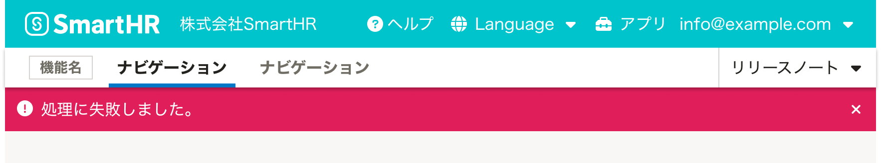スクリーンショット: HeaderとAppNaviとNotificationBarが垂直方向に積み重なっている。NotificationBarはerror状態で、「処理に失敗しました。」というメッセージが表示されている。