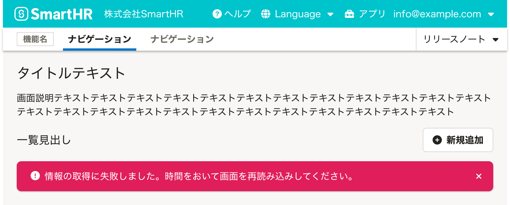 スクリーンショット: HeaderとAppNaviとPageHeadingとページの説明テキストとよくあるテーブルの見出しと新規追加ボタンが垂直方向に積み重なっている。Tableが表示されるべき場所に、「情報の取得に失敗しました。時間をおいて画面を再読み込みしてください。」というメッセージが表示されたerror状態のNotificationBarがある。