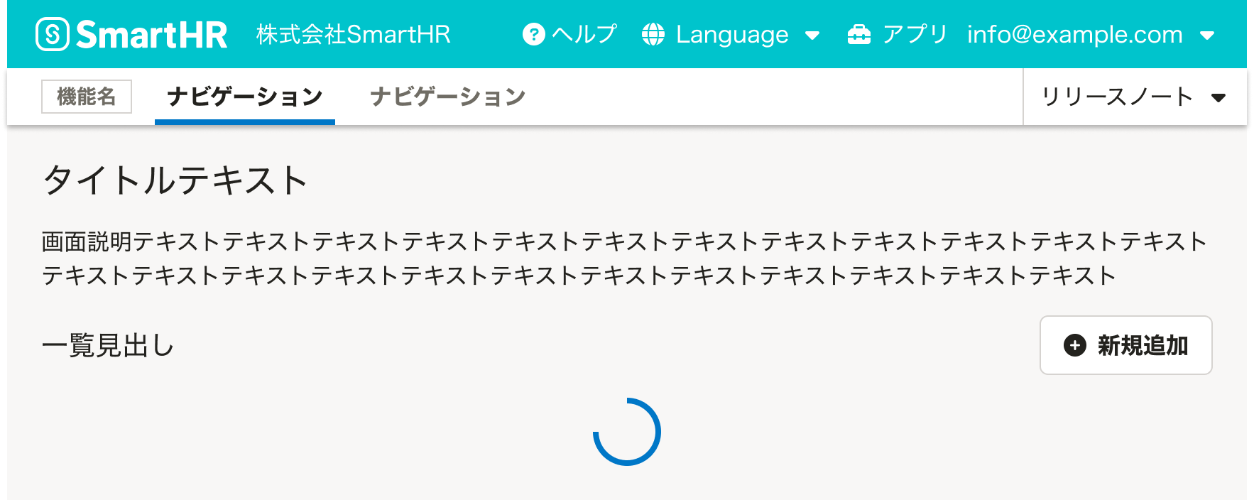スクリーンショット: HeaderとAppNaviとPageHeadingとページの説明テキストとよくあるテーブルの見出しと新規追加ボタンが垂直方向に積み重なっている。Tableが表示されるべき場所に、Loaderが表示されている。
