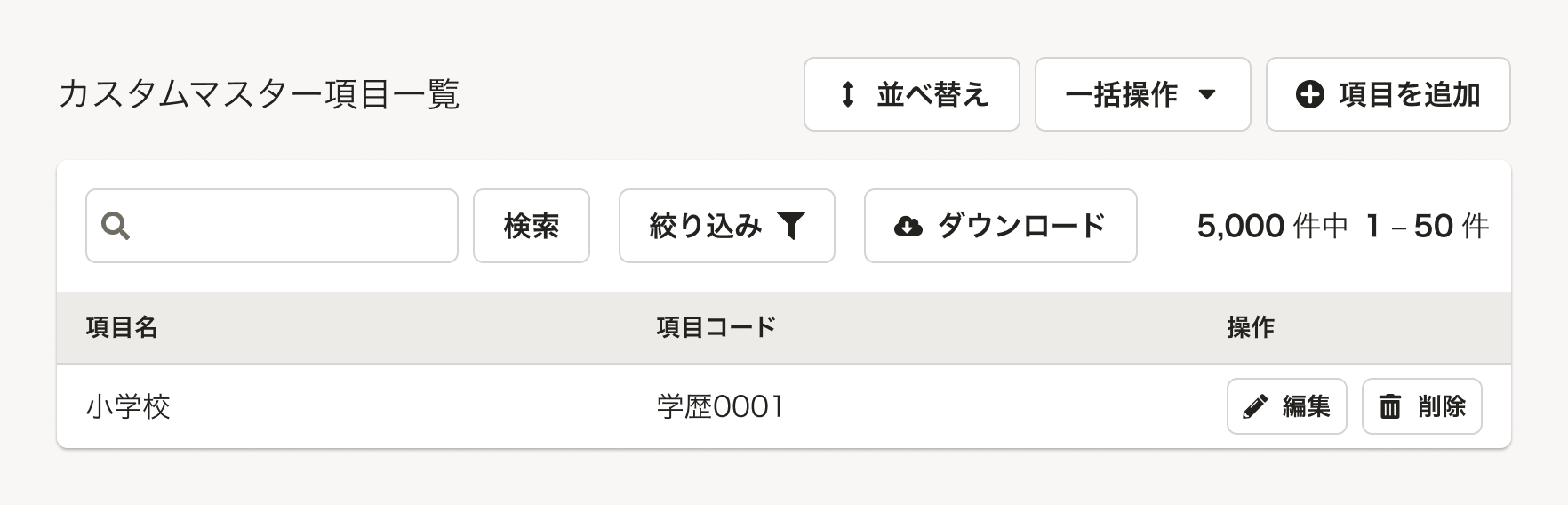 以下に限らず、扱う機能やユースケースによって、データの追加・一括変更などに関わるアクションボタンを配置できます。